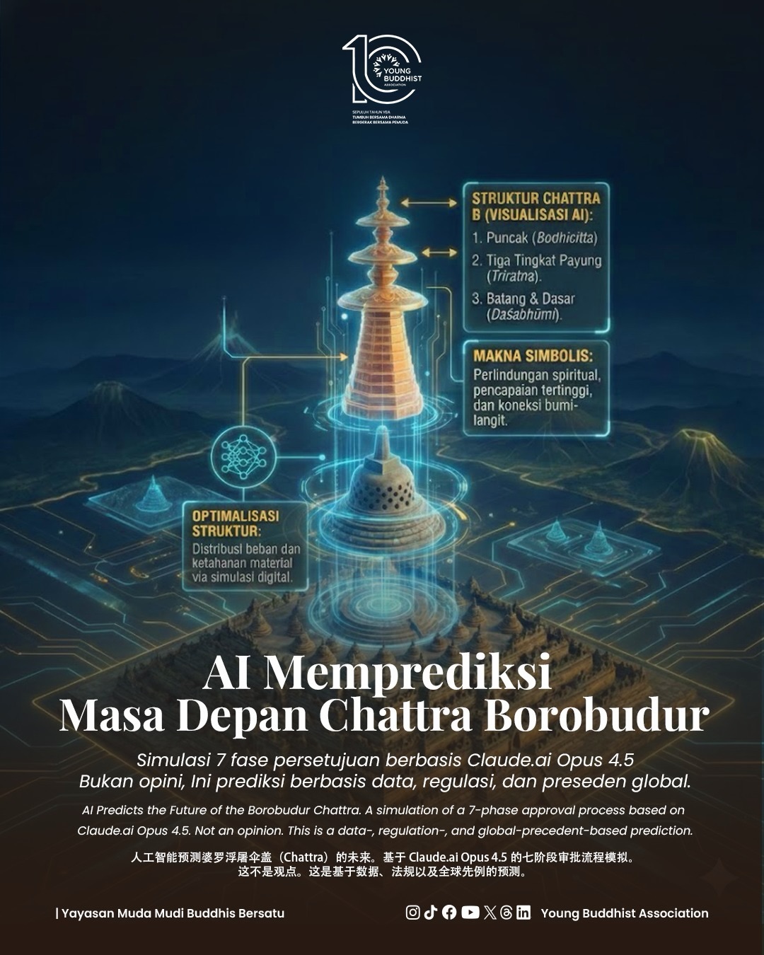 Pemasangan kembali Chattra (payung suci) di puncak Candi Borobudur kini memasuki babak baru dengan pemanfaatan teknologi kecerdasan buatan (AI). Young Buddhist Association (YBA) Indonesia menggunakan model AI Claude.ai Opus 4.5 untuk mensimulasikan hasil keputusan dan memetakan risiko serta peluang terkait proyek ini. Langkah ini diambil bukan untuk mengambil keputusan, melainkan untuk memastikan proses yang rasional, terukur, dan bertanggung jawab secara global.