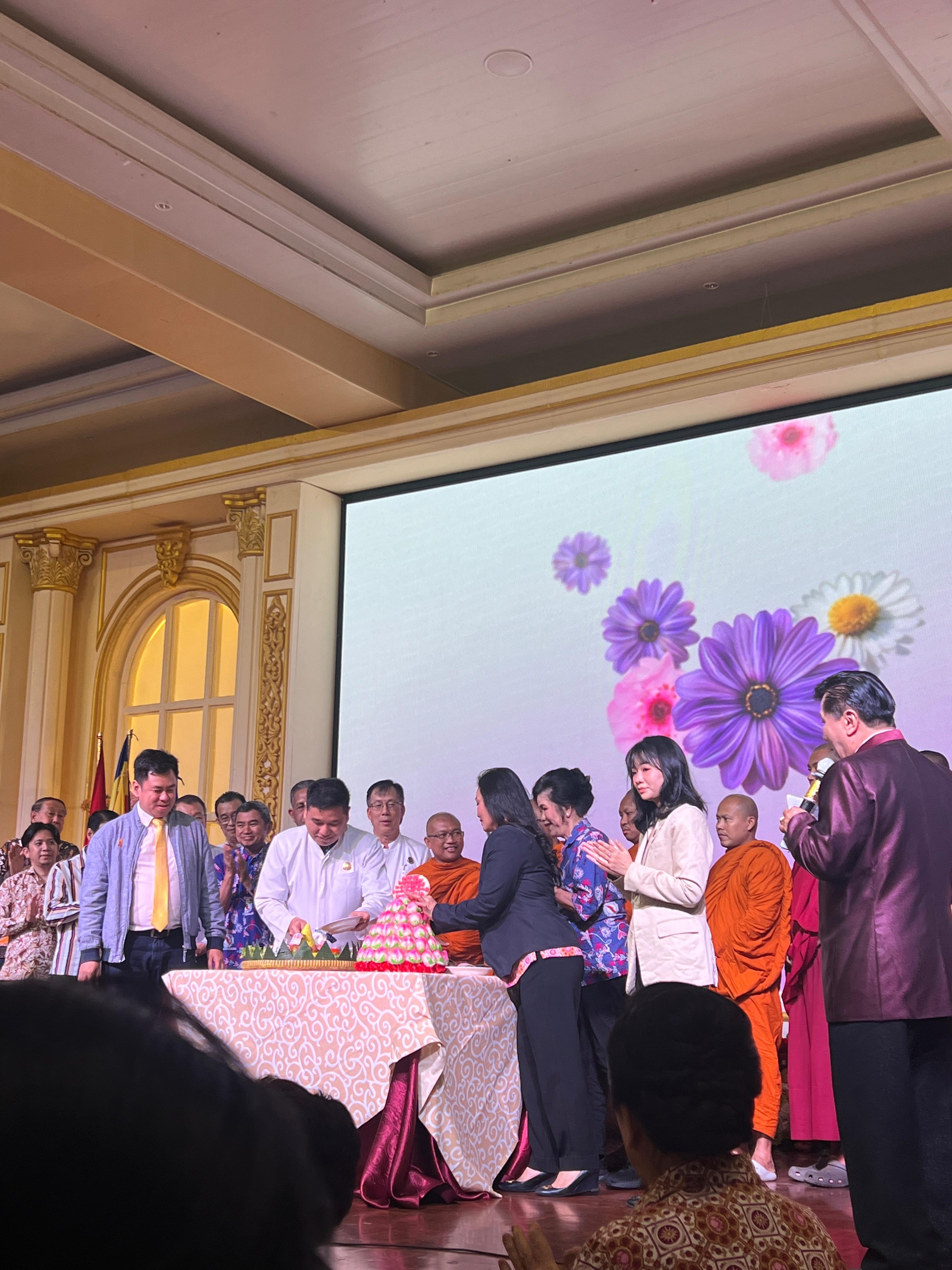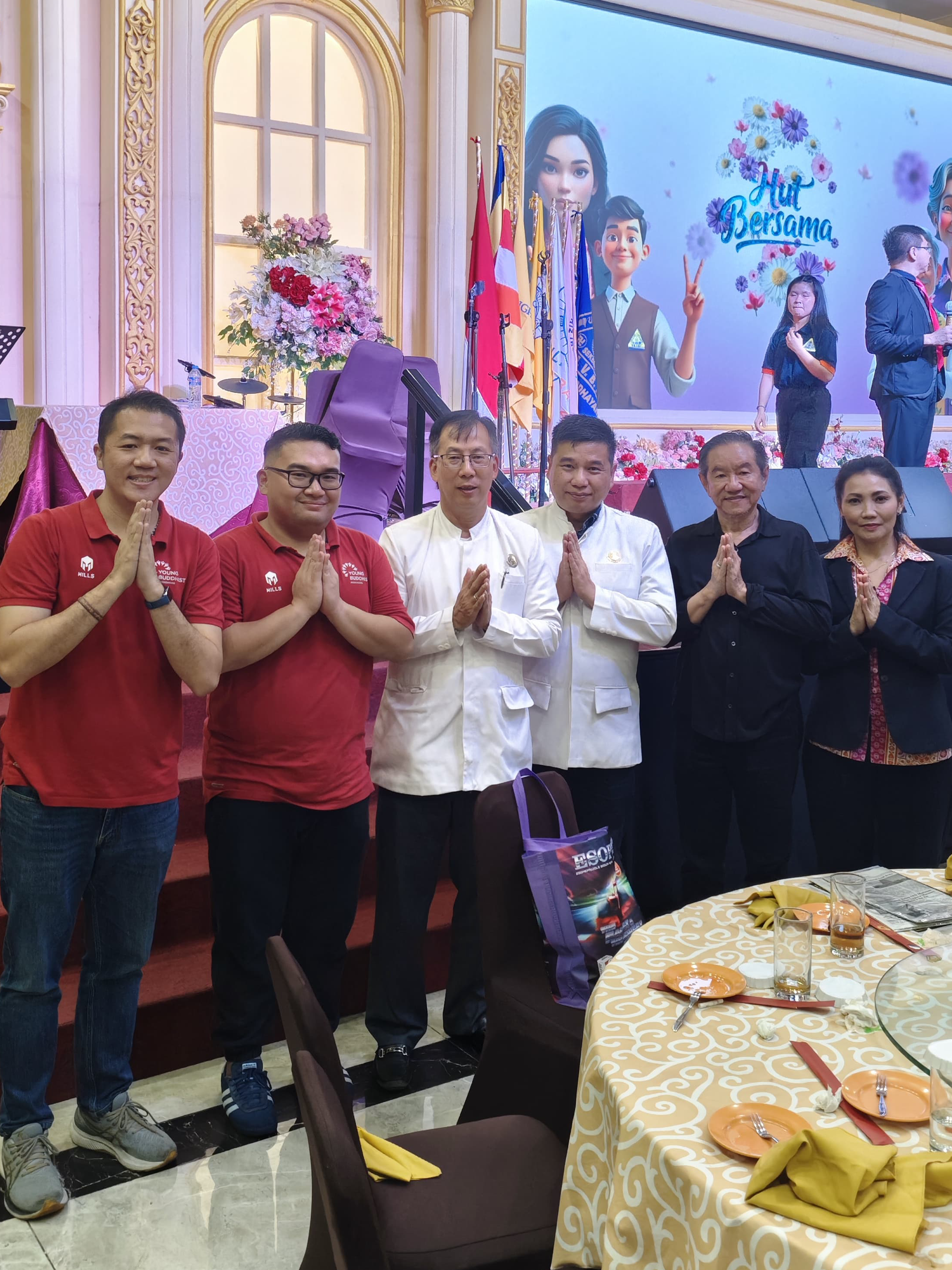 Tak ketinggalan, sesi potong kue ulang tahun bersama menjadi momen puncak acara. Dengan latar LED bertuliskan “HUT Bersama” yang dihiasi ilustrasi karakter dari berbagai usia, suasana menjadi hangat dan penuh kebahagiaan. Para Bhikkhu, pengurus, dan perwakilan komunitas naik ke panggung, disambut tepuk tangan meriah dari para tamu undangan.